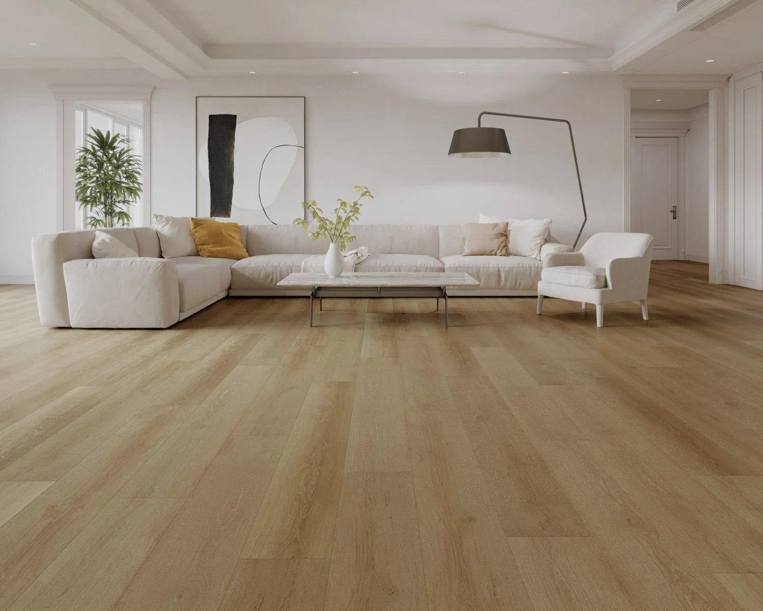 This vinyl plank is a low variation of warm browns, ranging from a light buttery cream to a medium brown. This vinyl plank naturally brightens a room and spotlights light-colored furniture, such as the ones in our room example. However, with its hints of medium tones, it can also accentuate darker-colored furniture, providing the best of both worlds!